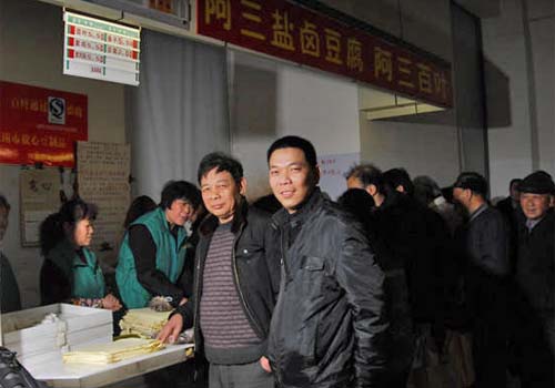 在無錫吃到百葉,不能不提:阿三。阿三就是賣百葉老板賀三南的小名,現年59歲,攤位位于朝陽菜場二樓東側,豆制品專區。20來年前,這位來自無錫長安堰橋鎮王家莊村的阿三,以靠著出擔八條繩,挑著自己做的百葉豆腐走街穿巷叫賣為生。如今,阿三的祖傳的百葉事業已經傳到兒子賀高陽的手里,“阿三百葉”也已經品牌注冊了,成為無錫市放心豆制品。在這里,阿三百葉阿三鹽鹵豆腐的牌子很響,你要想吃到這里的百葉和豆腐,不僅要排隊,還必須乘早排。這里的排隊也很夸張,基本上就是從開張一直排隊到百葉豆腐賣光為止,從不間斷。