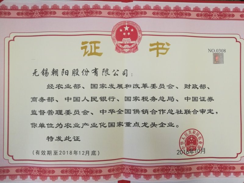 無錫朝陽股份有限公司經(jīng)審定為2016-2018年度農(nóng)業(yè)產(chǎn)業(yè)化國家重點龍頭企業(yè)
