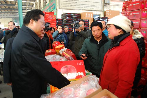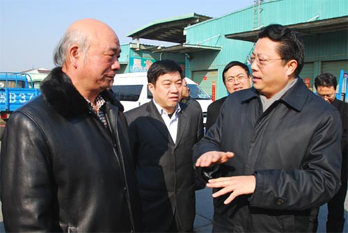 隆冬的江南大地,低溫寒風(fēng)依舊,但明媚的陽光預(yù)示著春天腳步的臨近。節(jié)前的朝陽農(nóng)產(chǎn)品大市場(chǎng),也早已是車水馬龍、熱鬧非凡。朝陽集團(tuán)董事長(zhǎng)張海良向楊書記一行介紹了市場(chǎng)為確保節(jié)日蔬菜、糧油等與居民生活密切相關(guān)的商品供應(yīng)所做的不懈努力,展示了蔬菜農(nóng)藥殘留檢測(cè)中心、信息中心、交易結(jié)算中心的運(yùn)作模式。楊書記還饒有興趣地與市場(chǎng)內(nèi)的經(jīng)銷商戶交談,了解商品來源和銷售情況。