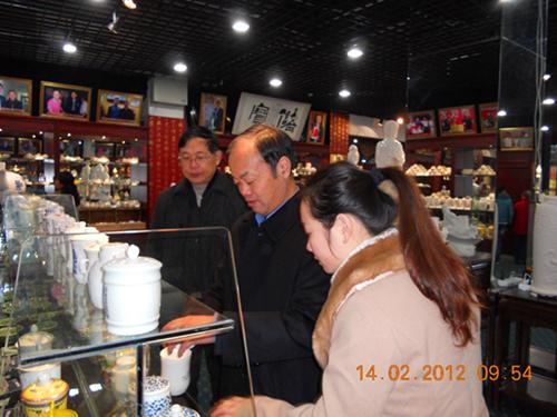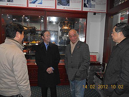 在集團董事長張海良先生、總經理楊興德先生的陪同下,傅會長和王秘書長興致勃勃的參觀了無錫文化工藝品市場,先后在中國陶都陶瓷國際博覽中心無錫藝術館、國家級非物質文化遺產南京吉祥云錦等展館欣賞了眾多國家級工藝美術大師們的藝術珍品,對展館內精雕細刻、美輪美奐的工藝展品贊不絕口,對朝陽集團大膽涉足文化產業、繁榮文化市場的創舉表示認同和贊許。