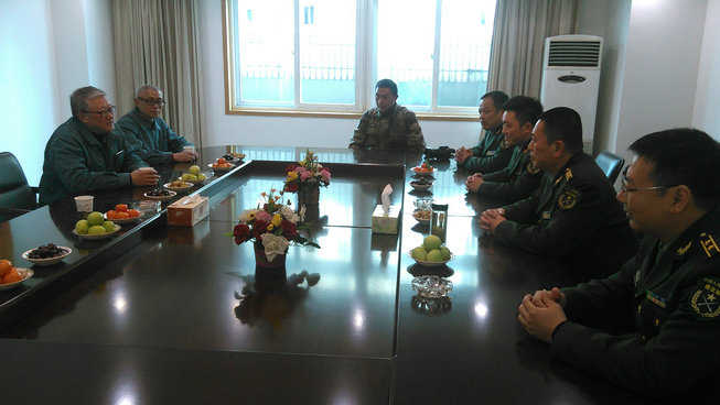 2015羊年新春即將來臨,為進一步密切軍企關系,2月10日上午,無錫朝陽集團黨委副書記、工會主席王愛群帶領集團辦公室同志一行,來到軍民共建單位——中國人民武裝警察8720部隊警衛連進行走訪,為連隊戰士們送去了新春的慰問。警衛連王連長、邱指導員和鄒副連長熱情歡迎王書記的到來。