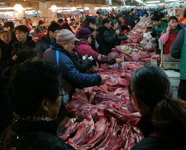 春節臨近,朝陽農貿市場二樓牛羊肉攤位前人氣火爆,牛羊肉十分熱銷。