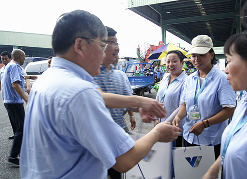 下午二點多的朝陽農(nóng)產(chǎn)品大市場內(nèi),商品整齊豐滿,車輛川流不息。產(chǎn)業(yè)集團領導先后來到大廈檢票門、水果五通道、中央大道、水果五號門、蔬菜五號門、北濱路一號門等地方,親切慰問了正在崗位上揮汗如雨、辛勤工作的安保人員、司磅員等,為他們送上高溫慰問品,帶去產(chǎn)業(yè)集團領導對他們的深切關懷。市場員工在感謝和感動之余,紛紛表示,將繼續(xù)發(fā)揚不怕苦不怕累的精神,堅守崗位,做好自己的本職工作。