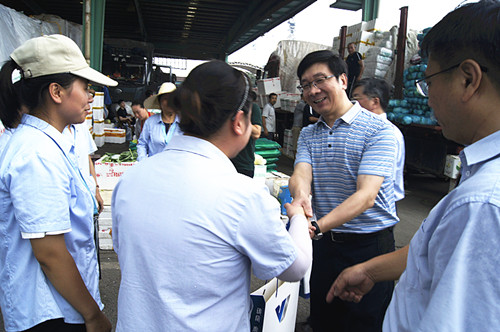 7月27日下午,無錫產(chǎn)業(yè)發(fā)展集團有限公司黨委副書記、工會主席劉濤、副總裁張曉耕等領導在朝陽集團黨委書記、工會主席錢韌、副總經(jīng)理朱健祥的陪同下,冒著高溫酷暑,來到朝陽農(nóng)產(chǎn)品大市場進行慰問。