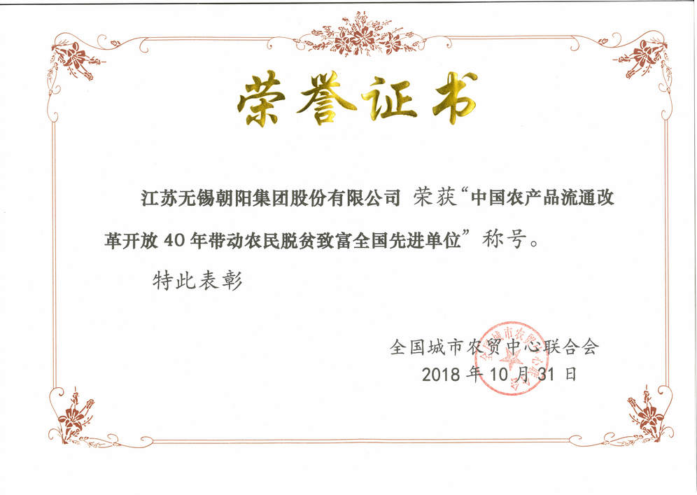 江蘇無(wú)錫朝陽(yáng)集團(tuán)股份有限公司榮獲“中國(guó)農(nóng)產(chǎn)品流通改革開放40年帶動(dòng)農(nóng)民脫貧致富全國(guó)先進(jìn)單位”稱號(hào);