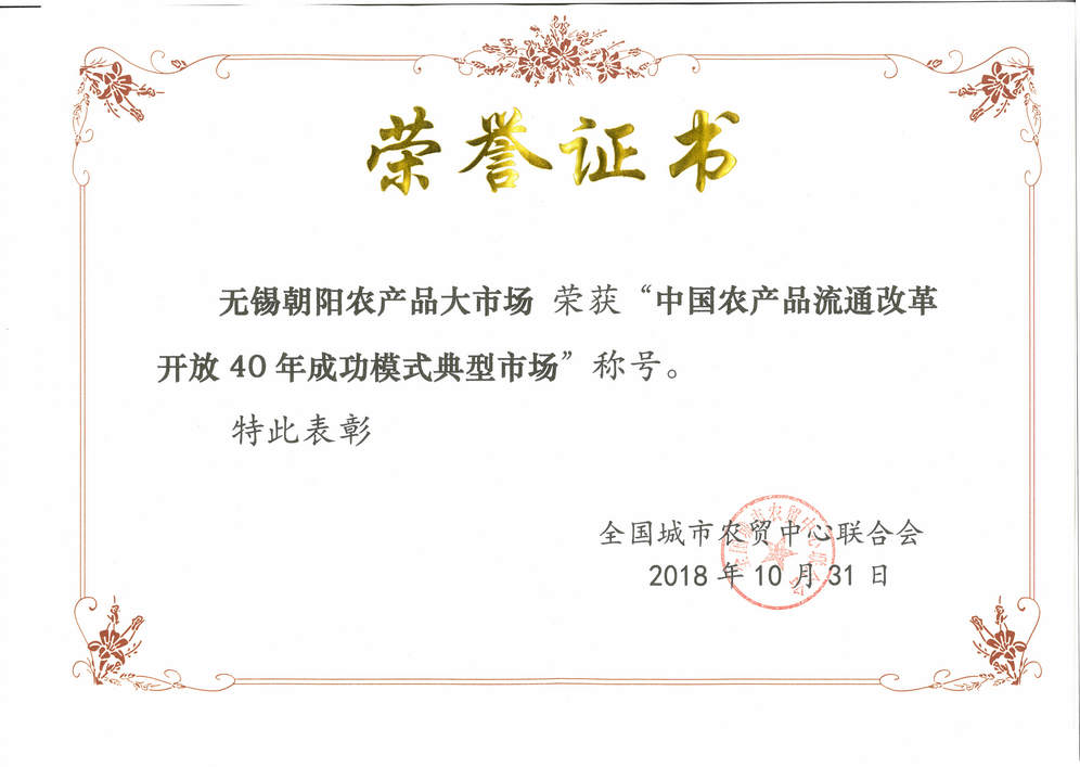 無(wú)錫朝陽(yáng)農(nóng)產(chǎn)品大市場(chǎng)榮獲“中國(guó)農(nóng)產(chǎn)品流通改革開放40年成功模式典型市場(chǎng)”稱號(hào);