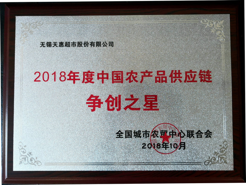 無(wú)錫天惠超市股份有限公司榮獲“2018年度中國(guó)農(nóng)產(chǎn)品供應(yīng)鏈爭(zhēng)創(chuàng)之星”稱號(hào)。