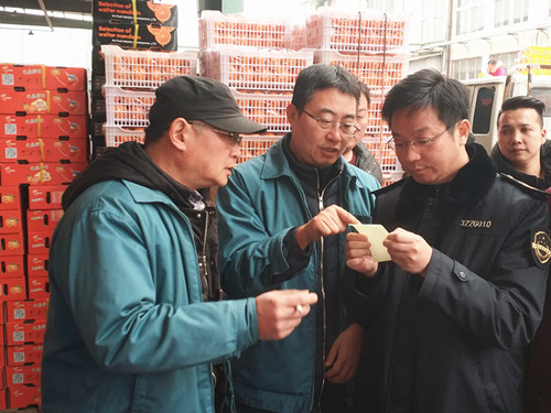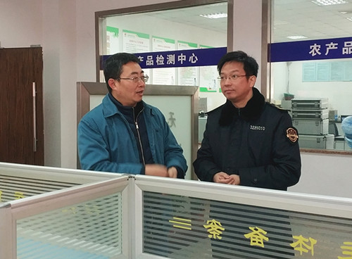 胡局一行先后來到監(jiān)控中心、蔬菜備案中心、檢測中心、結(jié)算中心,聽取了朱總就大市場在溯源體系建設(shè)、蔬菜準(zhǔn)入、農(nóng)產(chǎn)品檢測、食品安全維護(hù)等工作的匯報。隨后他們又來到蔬菜、水果、家禽市場,現(xiàn)場檢查了農(nóng)產(chǎn)品在市場流通的各個環(huán)節(jié),了解了索證索票、消毒消殺等工作的執(zhí)行落實情況,對市場在食品安全方面所做的工作表示認(rèn)可,并希望市場在春節(jié)期間進(jìn)一步加強(qiáng)食品安全工作,確保消費(fèi)者買得放心、吃得放心。