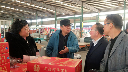 在秦書記的陪同下,一行人先后參觀了三中心、蔬菜、水果兩大市場、冷庫、北二庫及糧油市場。秦書記首先向來訪人員介紹了梁家河蘋果和洛川蘋果等陜西特色水果在大市場的銷售情況,隨后又詳細介紹了大市場近年來在電子化交易結算、社會化配送、溯源體系建設、食品安全檢測等方面所取得的成果。王書記對大市場的經營管理模式與發展前景給予了高度的贊揚和充分的肯定。