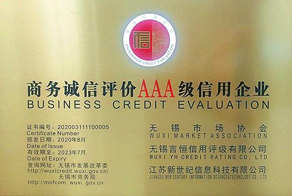 近日,無錫朝陽股份有限公司被無錫市商務局、無錫市場協會評為“商務誠信評價