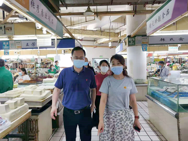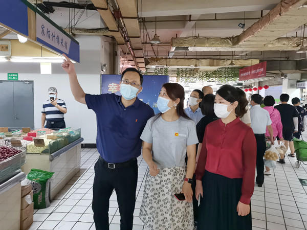 7月31日上午,無錫市商務局汪行局長、梁溪區商務局陳萍局長一行7人到無錫朝陽農貿市場檢查新冠病毒疫情防控工作,無錫朝陽集團張君君董事長陪同領導們來到各個區域進行檢查。 在蔬菜區,張君君董事長向領導們詳細地匯報了朝陽農貿市場關于新冠病毒防控措施的落實情況,包括門崗掃碼、測溫、檢查口罩、核酸檢測、疫苗接種等。 在家禽區、水產區、百貨區等區域現場,汪局和經營戶進行了親切的交流,詢問市場的價格行情,連聲表示朝陽農貿市場價格實惠,便民惠民。 在“三悅空間書吧”,詢問了市場去年改造項目的相關事宜,對在人頭攢動的菜場內植入文化元素、提供公共文化服務表示稱贊。 汪行局長對朝陽農貿市場的疫情防控工作和內部改造工作表示肯定,要求市場全力以赴做好防控保供工作。(華艷)