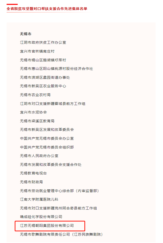 10月31日,中共江蘇省委、江蘇省人民政府發布《關于表彰全省脫貧攻堅暨對口幫扶支援合作先進集體和先進個人的決定》,為表彰先進、弘揚正氣,充分發揮典型示范作用,激發全省廣大干部群眾干事創業的責任感使命感,省委、省政府決定,授予308個集體“全省脫貧攻堅暨對口幫扶支援合作先進集體”稱號,江蘇無錫朝陽集團股份有限公司喜獲“全省脫貧攻堅暨對口幫扶支援合作先進集體”稱號。 江蘇無錫朝陽集團積極響應國家號召,堅持精準扶貧精準脫貧方略,充分發揮朝陽農產品大市場的主渠道流通集散功能,以及天惠連鎖超市、朝陽連鎖農貿市場、朝陽到家生鮮電商的品牌優勢和平價功能,為推動脫貧攻堅、對口幫扶、消費扶貧等方面發揮了重要作用,作出了積極貢獻。