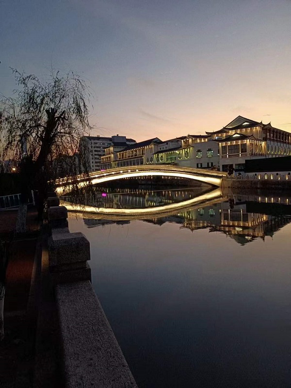 號外!號外!號外!就在剛才歷時6個月工期的羊腰灣橋舉行了隆重的開橋儀式。 該羊腰灣慢行橋通行后不僅縮短了羊腰灣路附近的居民來朝陽農貿市場、工藝品市場、魚鳥寵物市場采購游玩的路程、緩解了槐古路的交通壓力,而且為古運河上增添了一個靚麗的風景。 羊腰灣慢行橋橫跨古運河,西側為槐古路,東側為羊腰灣路。寬度40.8米,西側駁岸標高為3.0米。東側駁岸標高3.8米左右,該段古運河為旅游航道,最高通航水位2.5米,通航寬度12米,通航凈高2.5米。總投資2285.5萬元。 傍晚的羊腰灣橋亮化燈開啟后,加上工藝品市場古色古香的復古外觀造型也是古運河上的一道風景。(朱亮)