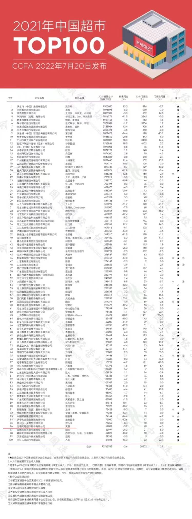 根據(jù)2021年度超市行業(yè)經(jīng)營情況調(diào)查結(jié)果,中國連鎖經(jīng)營協(xié)會發(fā)布“2021年中國超市Top100”。 面對困難和挑戰(zhàn),廣大超市企業(yè)一方面積極承擔(dān)社會責(zé)任,保供應(yīng),保價(jià)格,保品質(zhì),為抗擊疫情,保障居民生活穩(wěn)定做出突出貢獻(xiàn);另一方面加大創(chuàng)新力度,拓展線上業(yè)務(wù),優(yōu)化商品結(jié)構(gòu)和供應(yīng)鏈管理,企業(yè)數(shù)字化應(yīng)用不斷拓展和深入,精細(xì)化水平不斷提升,為下階段乃至未來的發(fā)展打下堅(jiān)實(shí)基礎(chǔ)。 天惠超市排名第96位,較上年持平。 (新聞來源:無錫博報(bào)、中國連鎖經(jīng)營協(xié)會) |