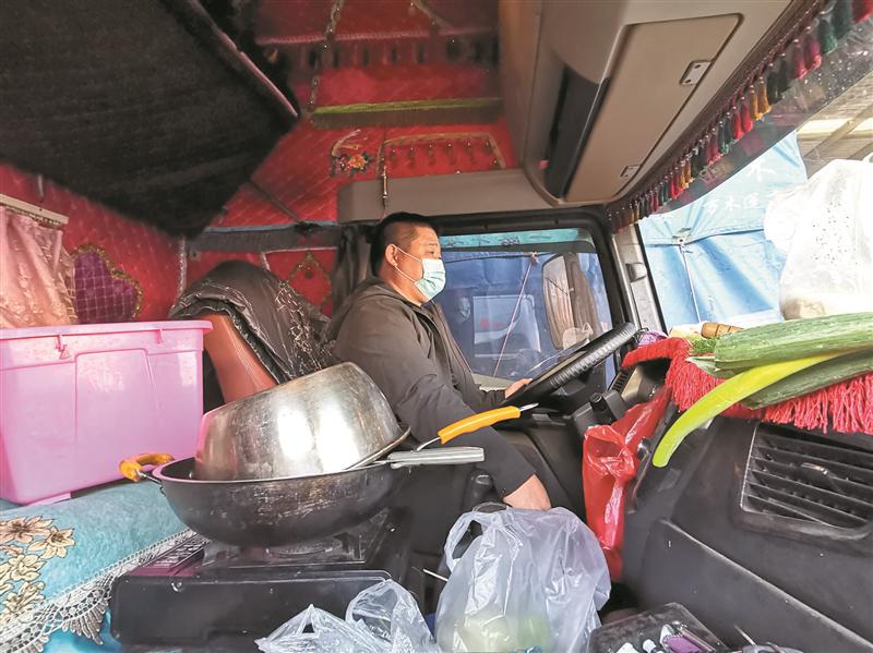 7.5平方米的駕駛室,是他可以四處奔走的家。困了翻過駕駛座就能躺下休息,服務區的快餐已經吃膩,他干脆買了瓦斯爐,架起鍋自己做飯。副駕駛座位下面放著大白菜和半袋大米,盆盆罐罐堆疊在床上,快見底的醬油瓶單獨放在塑料收納箱里。記者下午3點多去采訪時,梁輝中午沒吃完的紅燒排骨還在鍋里。