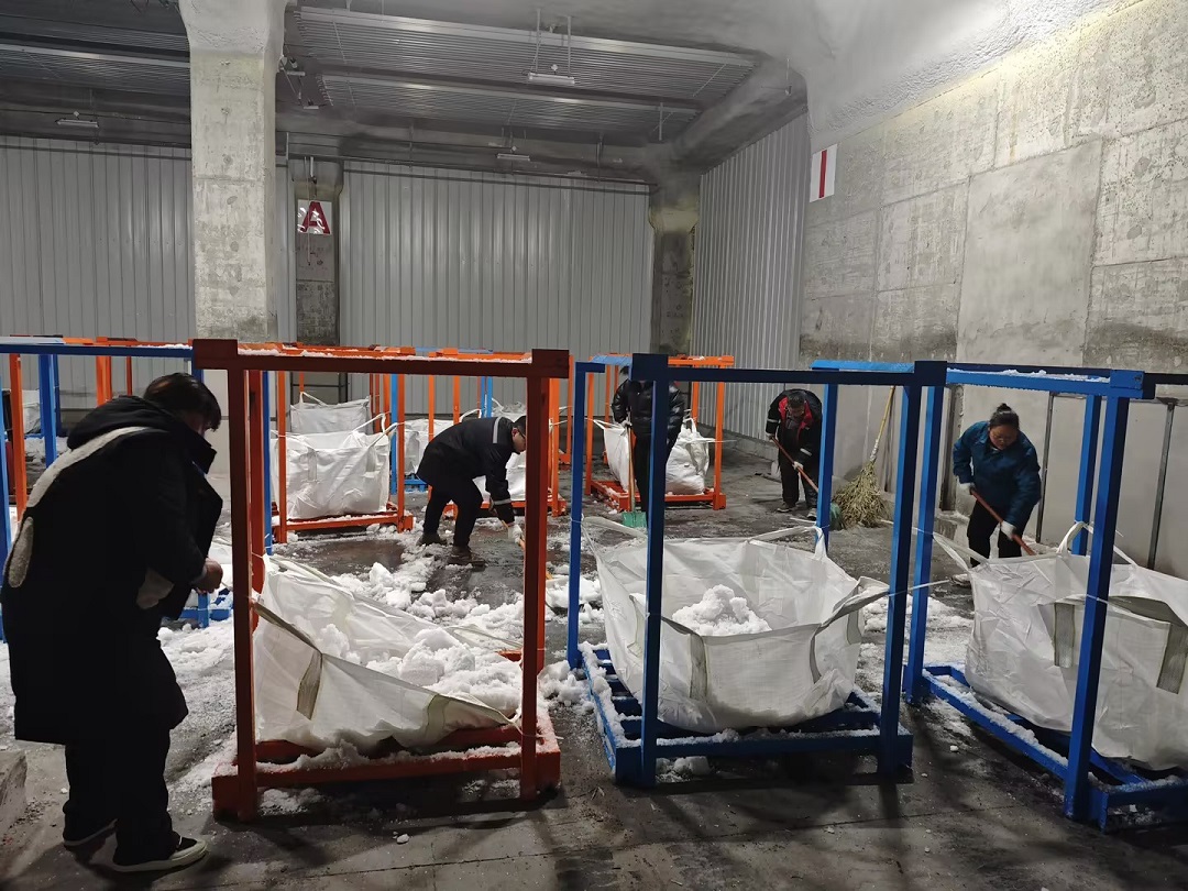 凍庫(kù)在運(yùn)行過(guò)程中,由于庫(kù)內(nèi)外溫差較大,制冷設(shè)備長(zhǎng)時(shí)間工作導(dǎo)致蒸發(fā)排管表面結(jié)霜較多,影響制冷效果,增加能耗。為使冷庫(kù)保持穩(wěn)定低溫,確保貨物存儲(chǔ)狀態(tài),降低設(shè)備耗能,朝陽(yáng)北區(qū)、冷庫(kù)聯(lián)系廠家、組織員工、協(xié)調(diào)搬運(yùn),于17.18日兩天開(kāi)展朝陽(yáng)冷庫(kù)11號(hào)庫(kù)除霜工作。 冷庫(kù)的除霜工作從冷庫(kù)機(jī)房開(kāi)始,廠家李師傅會(huì)同集團(tuán)北區(qū)、冷庫(kù)技術(shù)人員采用熱氟除霜法除霜,使排管表面結(jié)霜融化、脫落。隨著機(jī)房各設(shè)備的運(yùn)行,冷庫(kù)員工、搬運(yùn)工、叉車(chē)工等按照原定計(jì)劃,分工協(xié)作,有序開(kāi)展除霜工作。除霜開(kāi)始前,預(yù)先在鋁排管結(jié)霜下方安放巧固架,巧固架上套袋并固定,用于承接鋁排管上掉落霜塊,減少除冰鏟雪工作量。待鋁排管上霜塊全部掉落,大家便將巧固架四周掉落霜塊鏟入套袋,待四周積霜清理完畢,再由叉車(chē)工將裝滿冰霜的巧固架叉出庫(kù)外。大家鏟霜的鏟霜,掃霜的掃霜,相互配合,只為更好更快的把結(jié)霜清除干凈,以期盡快恢復(fù)11號(hào)庫(kù)使用。 通過(guò)除霜,降低了冷庫(kù)耗能,提高了運(yùn)行效率,為朝陽(yáng)萬(wàn)噸冷庫(kù)的安全運(yùn)營(yíng)奠定了良好的基礎(chǔ)。化霜結(jié)束后,后續(xù)還安排了鋁排管吊筋加固等維修工作。