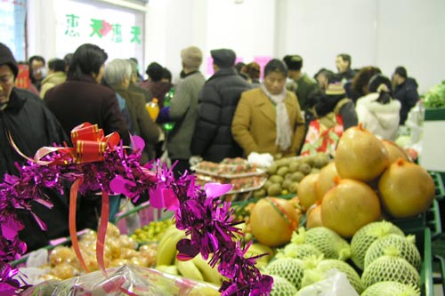 新年伊始,天惠超市敘豐里便民店開業了。雖然是星期天,但一大早就有附近的居民來此等候,他們早已盼望能夠有一家天惠店給他們提供質優價廉的新鮮蔬菜、豬肉等商品。小小的店堂不一會就被擠得滿滿當當。顧客們表示,要是店面再大一點就更好了。